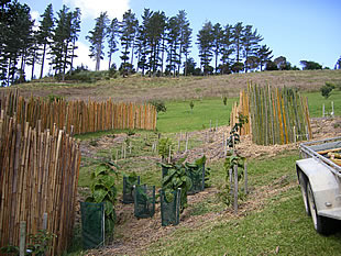 Eco-land Ltd was invited to design and implement native plantings of a coastal hill face by one of the owners of a subdivided block. The owner wanted to revegetate their only grassed area with native plants to simplify management. Eco-land Ltd was also invited to established 17000 native plants and create a subtropical orchard. A simple hand dug walk track system was also created. Eco-land has returned to establish a tropical orchard and complete further landscape planting work.